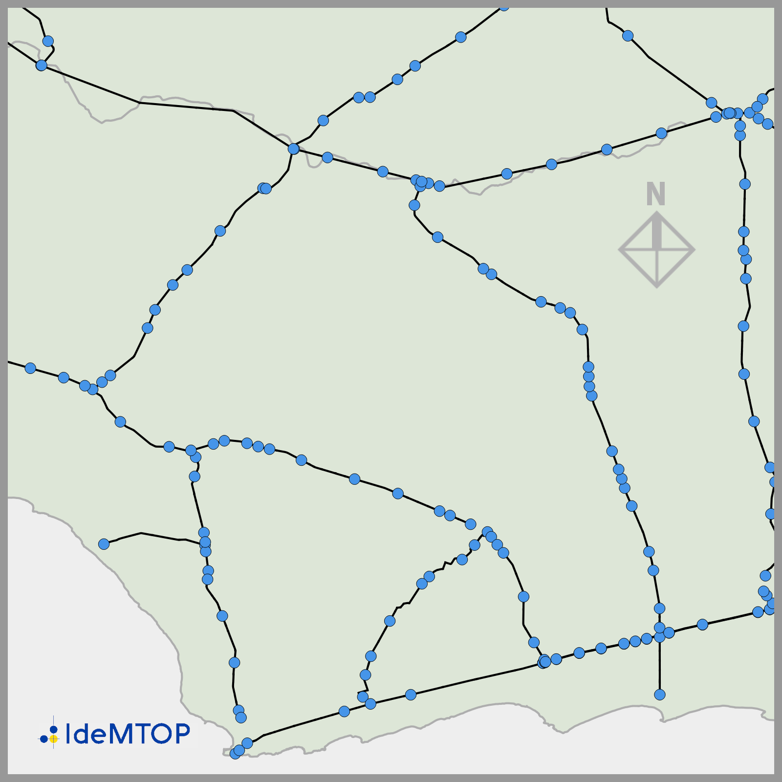 Mapa digital (vectorial) de puntos que representan las Alcantarillas ubicadas bajo la red activa de Vías Férreas del país, generada por la Dirección Nacional de Topografía del M.T.O.P. en coordinación con A.F.E., en base a levantamientos de campo realizados con tecnología G.N.S.S. y edición con programas S.I.G.. Se entiende por Alcantarilla a la construcción, de menor envergadura que un puente, que permite sortear un cauce de agua de menor importancia o desagotar los terrenos más altos por debajo de la vía férrea. Las hay abiertas (en los casos que la vía vuela entre apoyos) y cerradas (cuando la vía cruza apoyada sobre el terraplén que cubre la alcantarilla o apoyada sobre la losa superior de hormigón de la misma).
